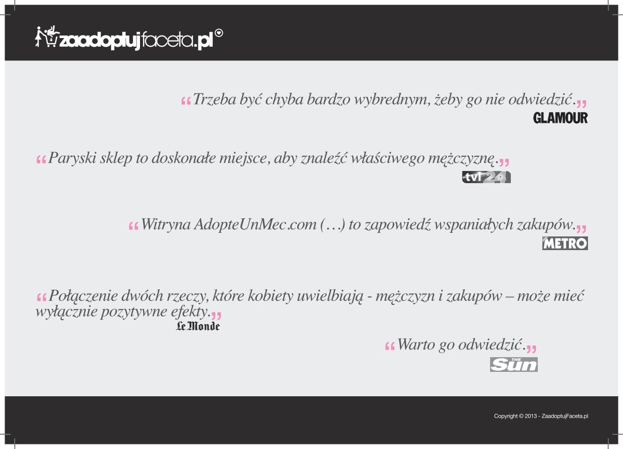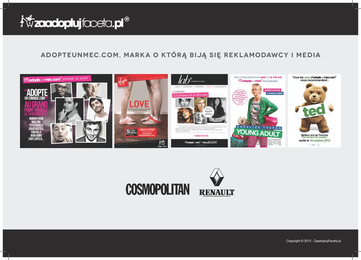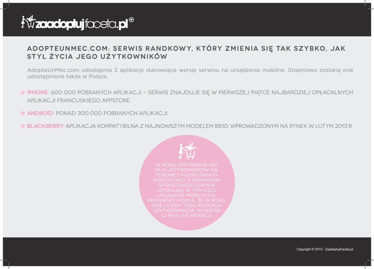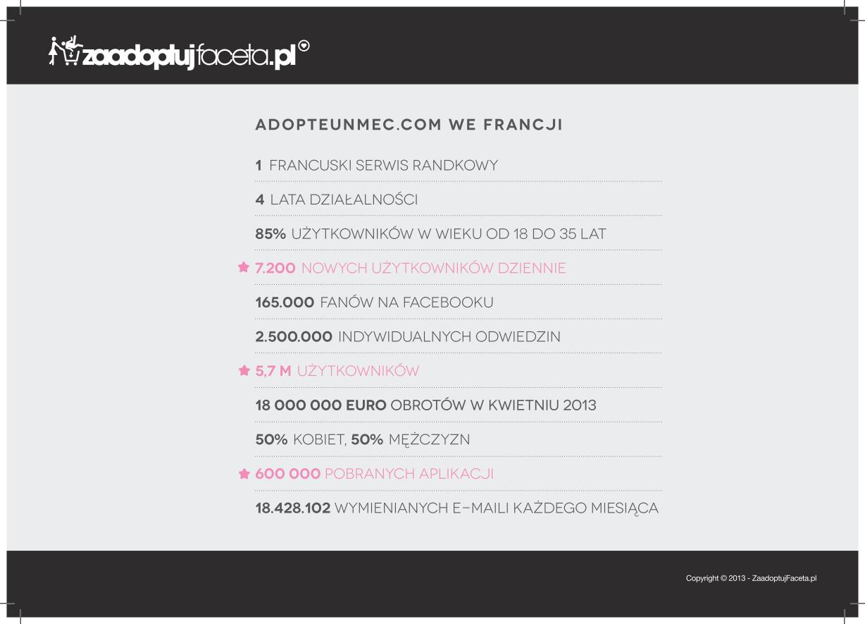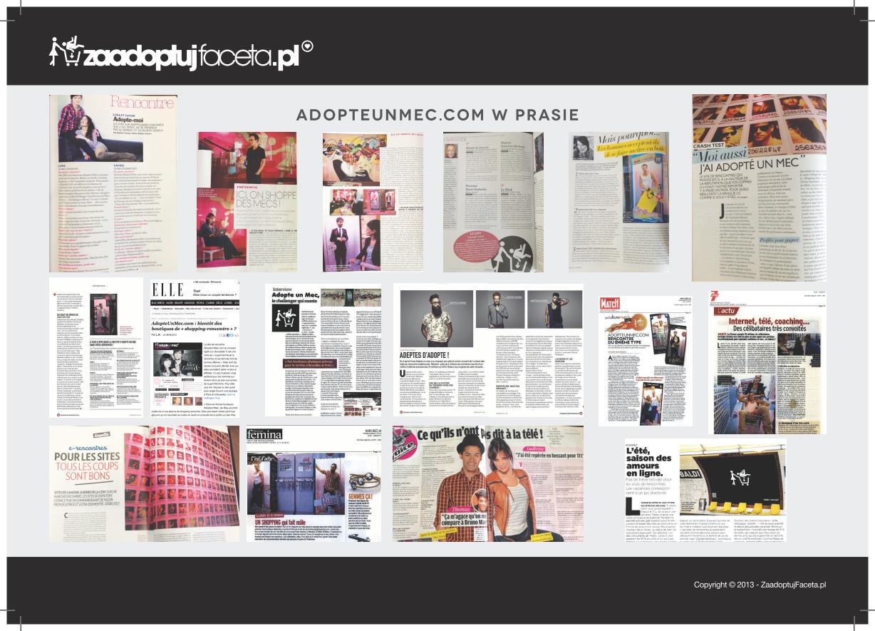 Transformację roli kobiet dostrzegł m.in. serwis ZaadoptujFaceta.pl, który zdobywa coraz większą popularność wśród młodych Polek i Polaków. Na ZaadoptujFaceta.pl to kobiety wybierają mężczyzn, z którymi chcą rozmawiać. I ta formuła ewidentnie działa, skoro wśród zarejestrowanych użytkowników jest 51 proc. kobiet i 49 proc. mężczyzn. Pod względem kulturowym jest to prawdziwa innowacja – w tradycyjnych kulturach kobietom nie wypadało uwodzić mężczyzn. Francuzi wręcz oszaleli na punkcie jego pierwowzoru – AdopteUnMec.com. Nie mieć tam konta to jak w Polsce nie być na Facebooku. Średni czas spędzany w serwisie to już 15 minut, co jest świetnym wynikiem (na Facebooku to odpowiednio 28 minut).Normą we Francji jest dzielenie się informacjami o nawiązanych znajomościach czy otrzymanych wiadomościach na AdopteUnMec.com.