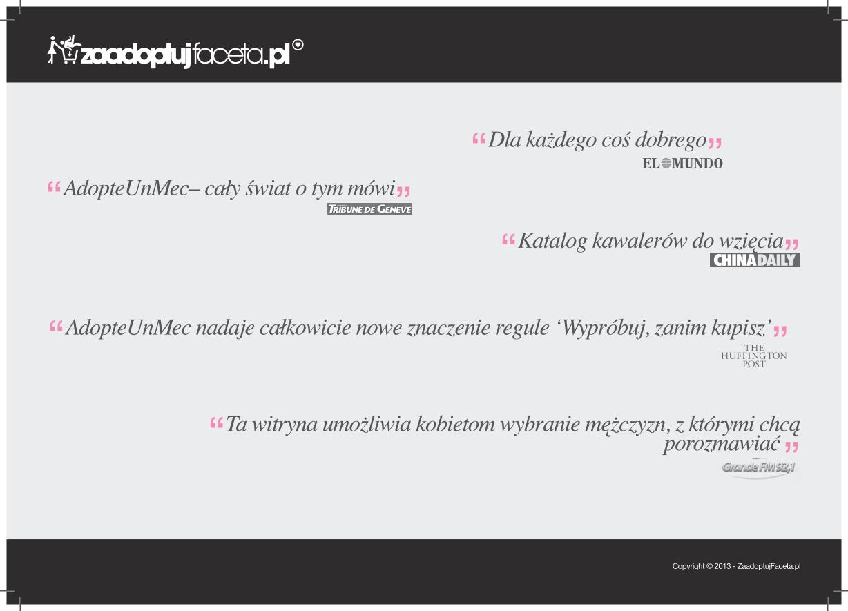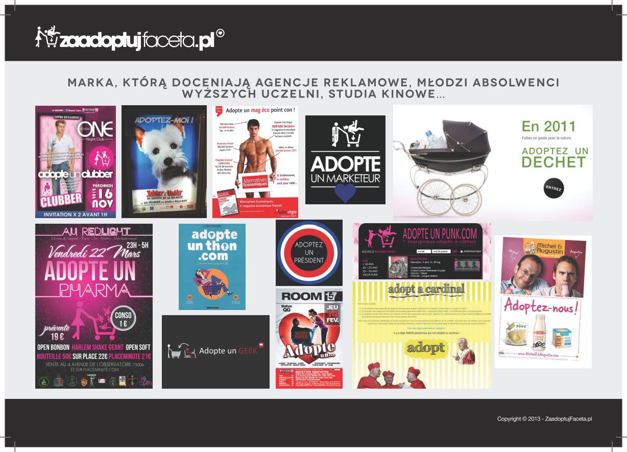 ZaadoptujFaceta.pl to niebanalny serwis społecznościowy, w którym władza należy do kobiet. Serwis zrywa ze stereotypem potulnej kobiety czekającej na księcia z bajki i odwraca role w relacjach damsko-męskich. W 2014 roku kobieta, która wykonuje pierwszy krok, nie powinna być uważana za „łatwą”. Portal odpowiada na oczekiwania generacji „wyrośniętych nastolatków”, którzy dotąd uważali serwisy randkowe za przestarzałe lub „dla prawdziwych desperatów”.